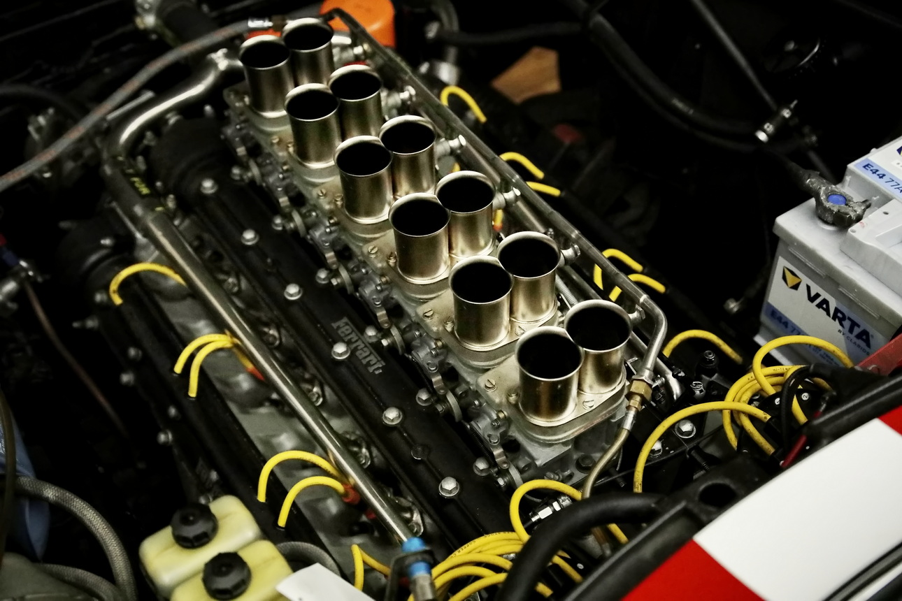 Motor: 12-Zylinder V-Motor, 60°, wassergekühlt, zwei obenliegende Nockenwellen je Zylinderreihe, zwei Ventile pro Zylinder, sechs Doppelvergaser Weber Typ 40 DCN18, Trockensumpfschmierung