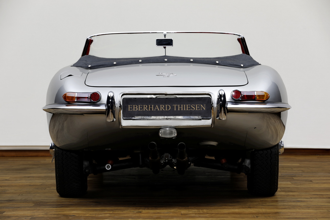 Dieser Jaguar E-Type Serie I als Open Two Seater (OTS), allgemein auch Roadster genannt, ist ein späteres Modell mit dem ausgereifteren 4,2 Liter Motor und dem vollsynchronisierten Viergang-Getriebe. Laut Jaguar Heritage Certificate erfolgte die Fertigstellung im August 1966 und die Auslieferung über Jaguar of Eastern Canada in Montreal. Das originale Farbschema war „Opalescent Silver Grey“ (Silbermetallic) mit Leder-Interieur in rot und einem Verdeck in schwarz.