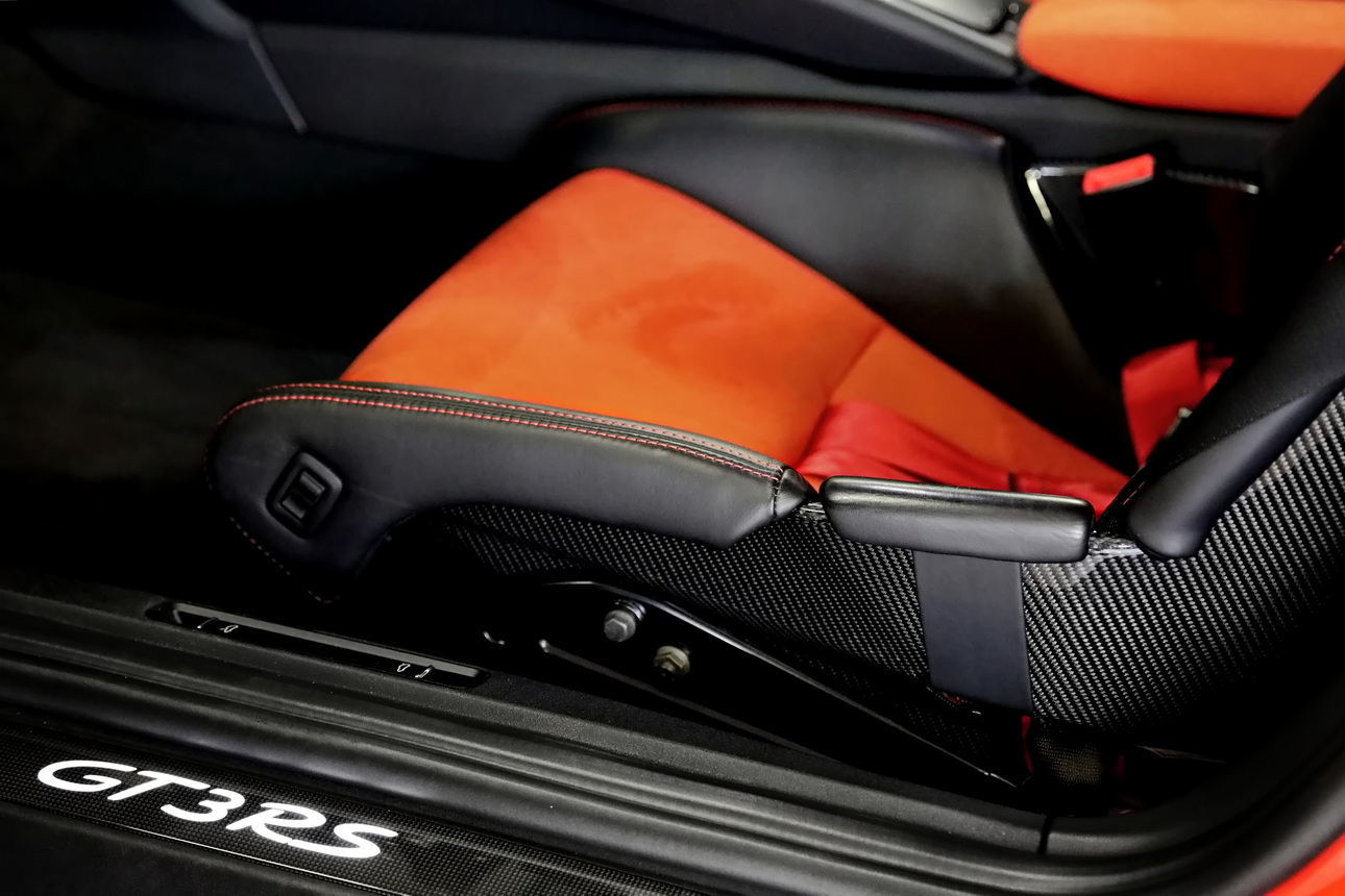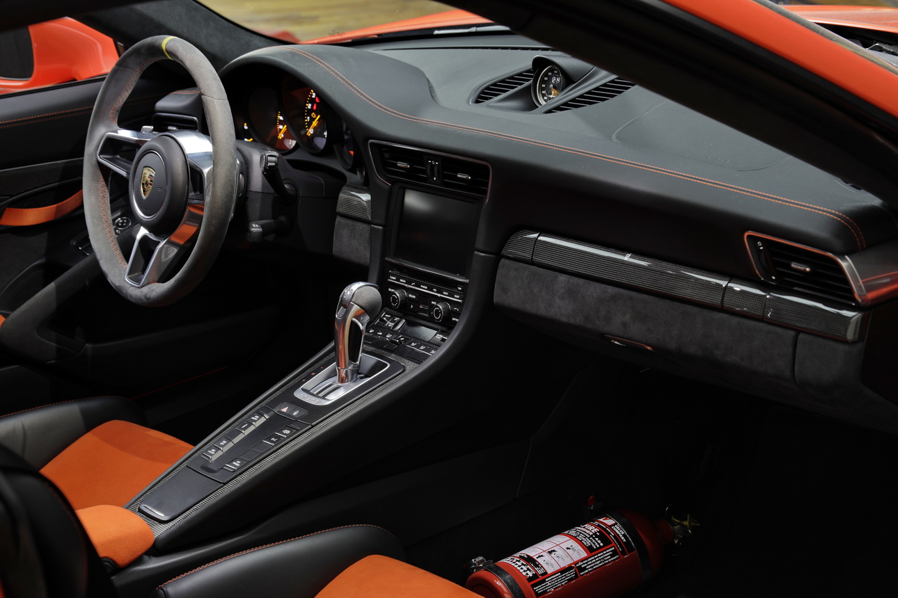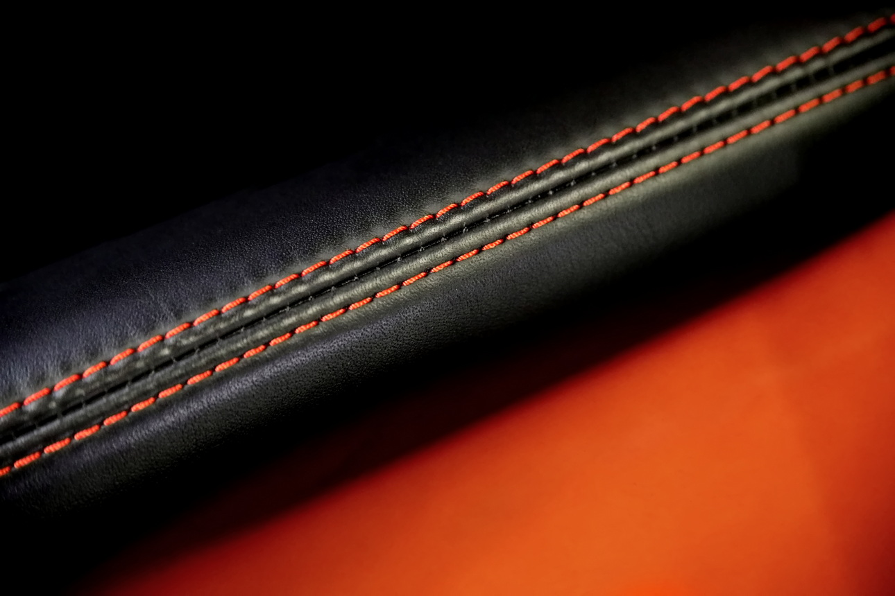 Farbkombination: Lavaorange (teilweise mit Schutzfolie), Interieur schwarz mit Sitzmittelbahnen in Alcantara orange, rote Ziernähte